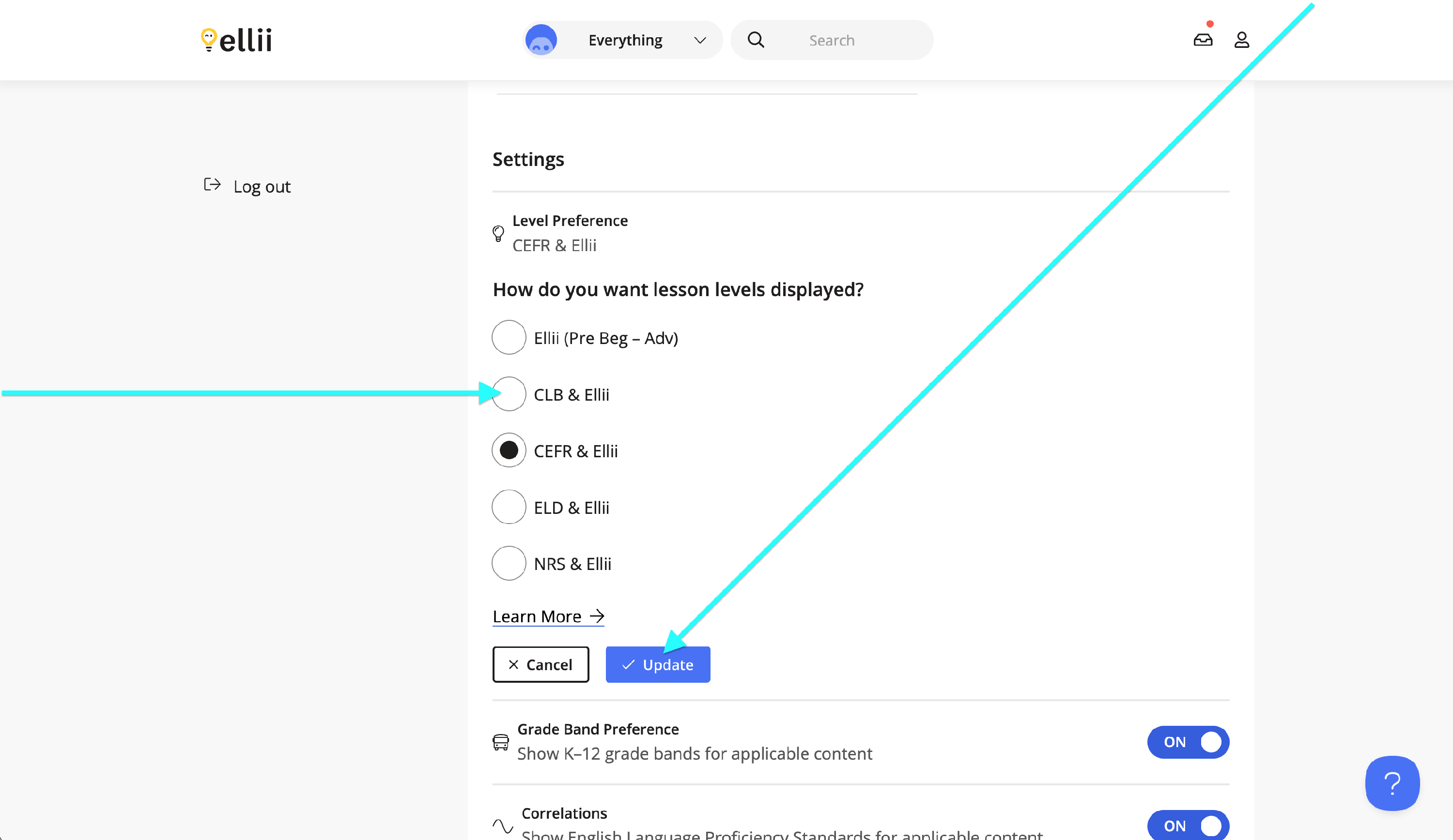 Under How do you want lesson levels displayed? select CLB & Ellii. Click the Update button to finish.