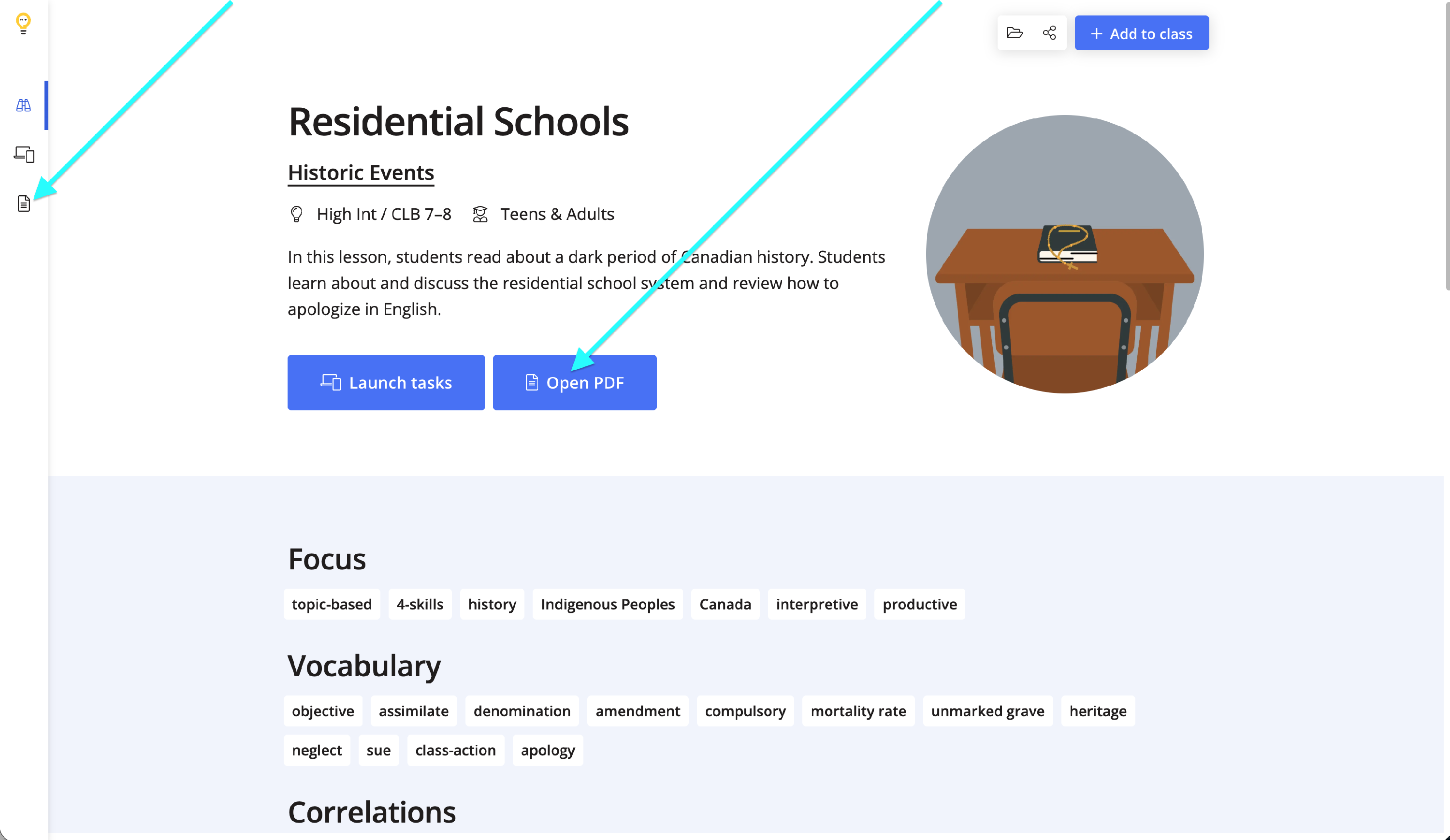 Once you have clicked into a lesson, you will click Open PDF.
