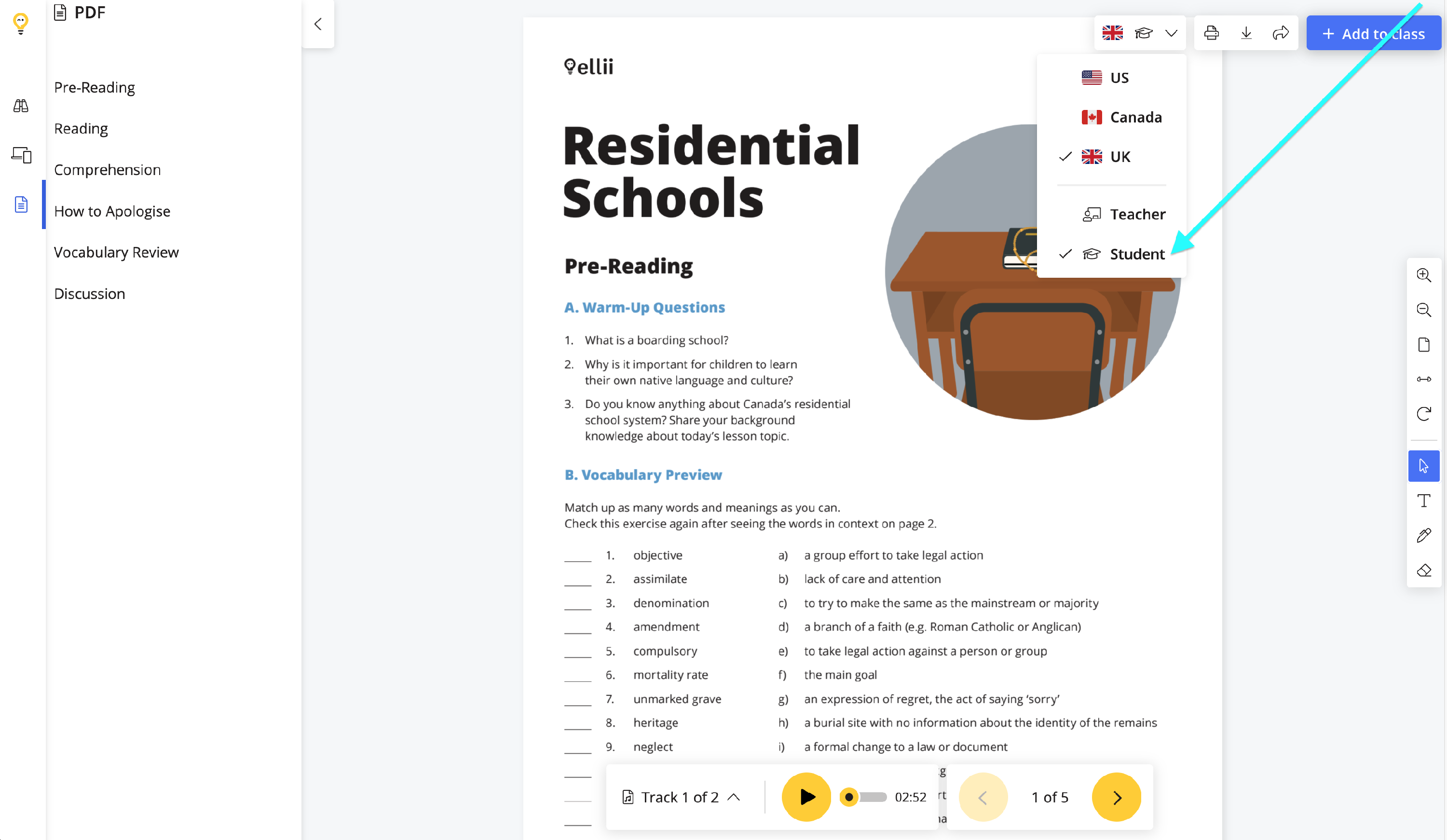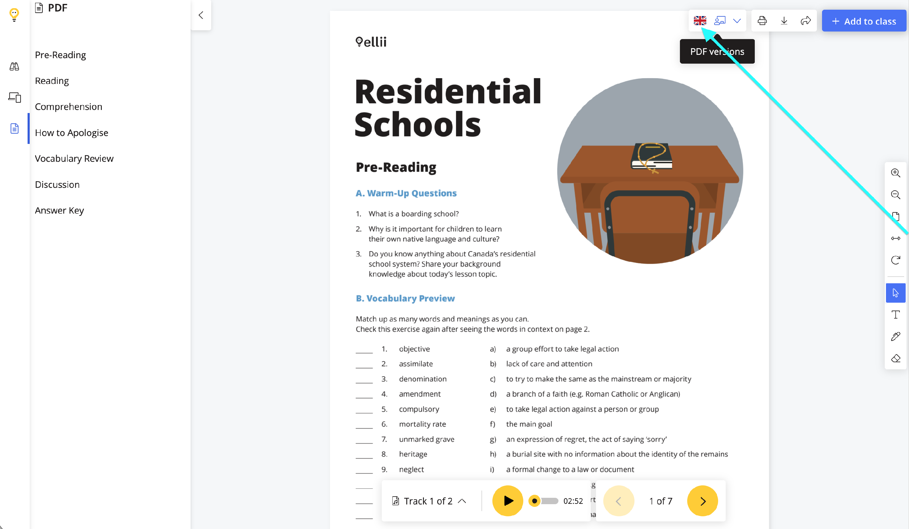Click the PDF versions button to choose the student version. You can also choose the spelling from this drop-down menu.