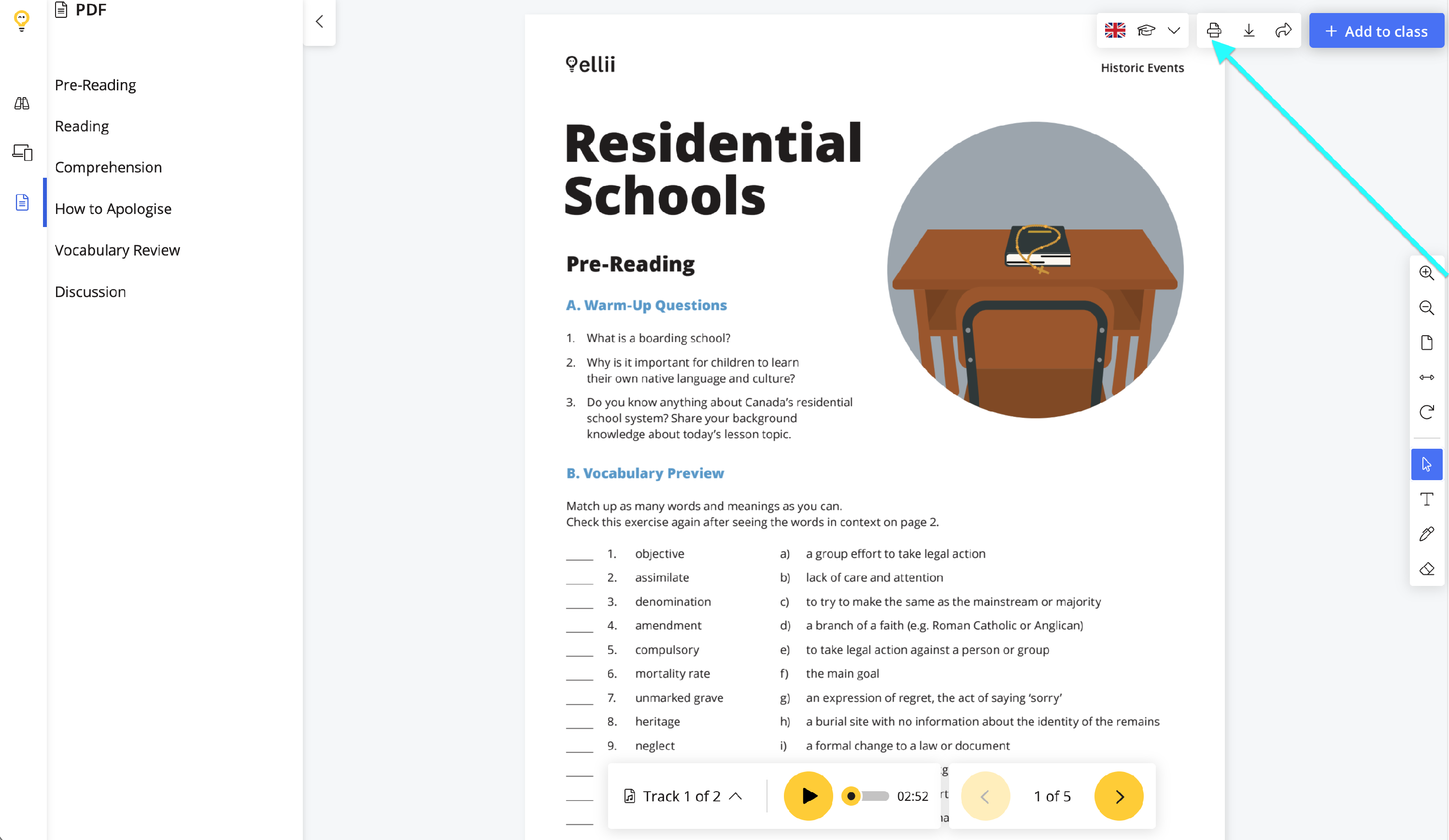 To print the lesson for class, select the print icon in the top right corner of the page (depending on your browser and PDF viewer attached to your browser).