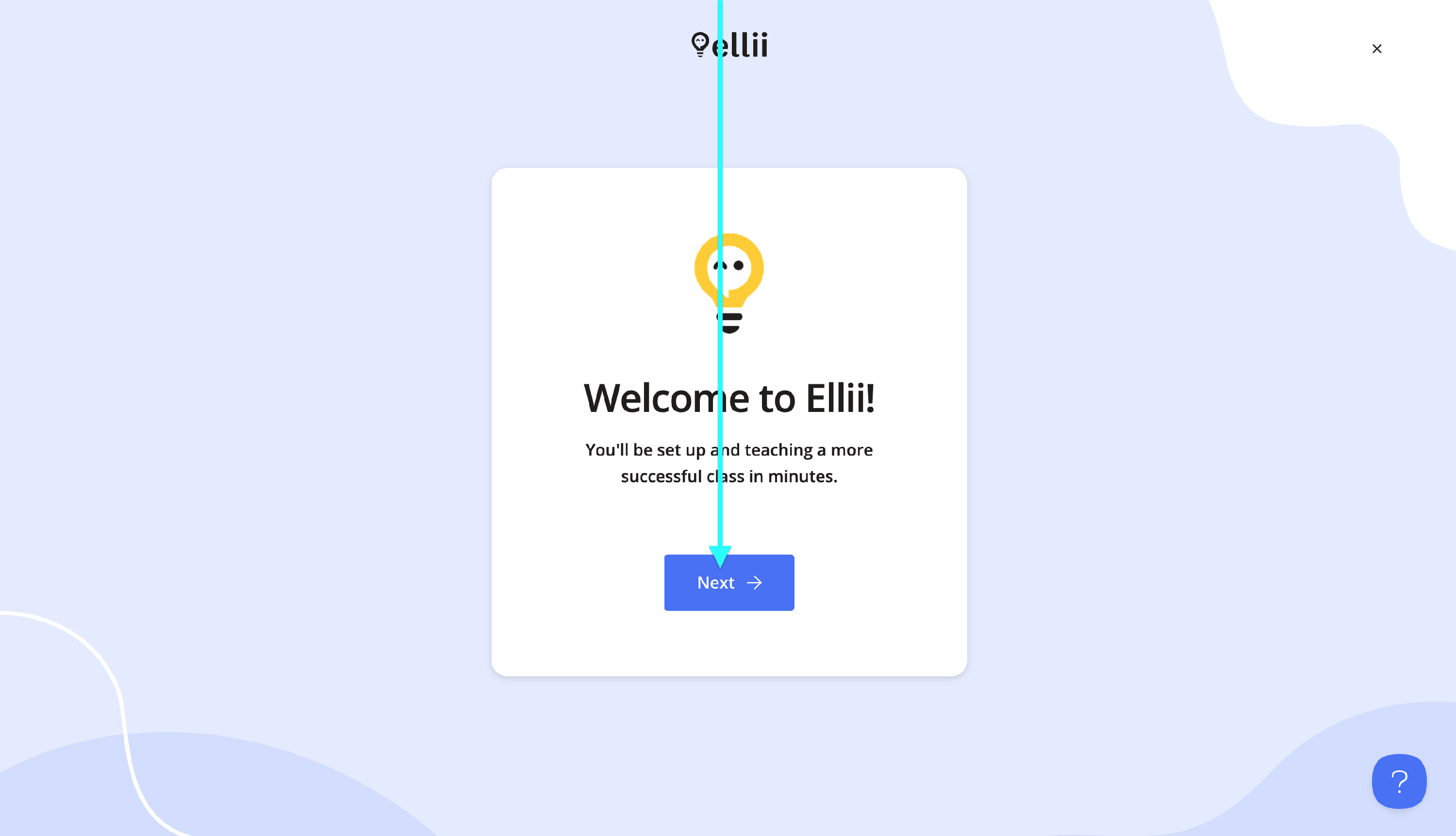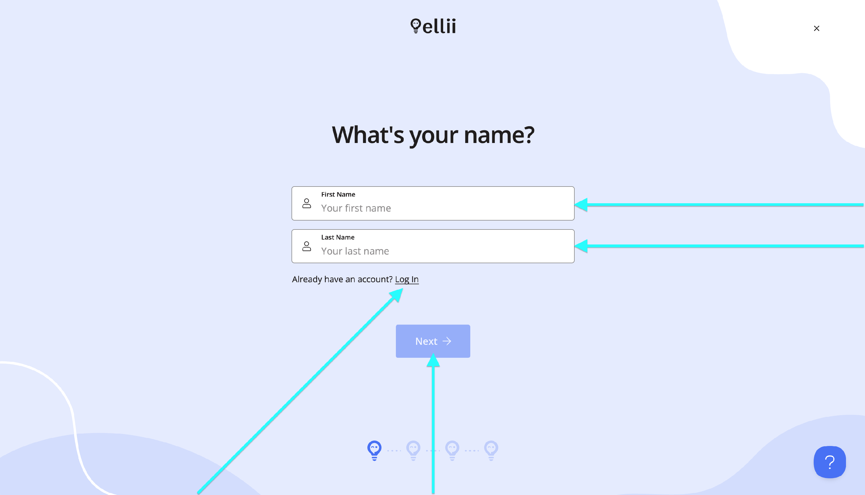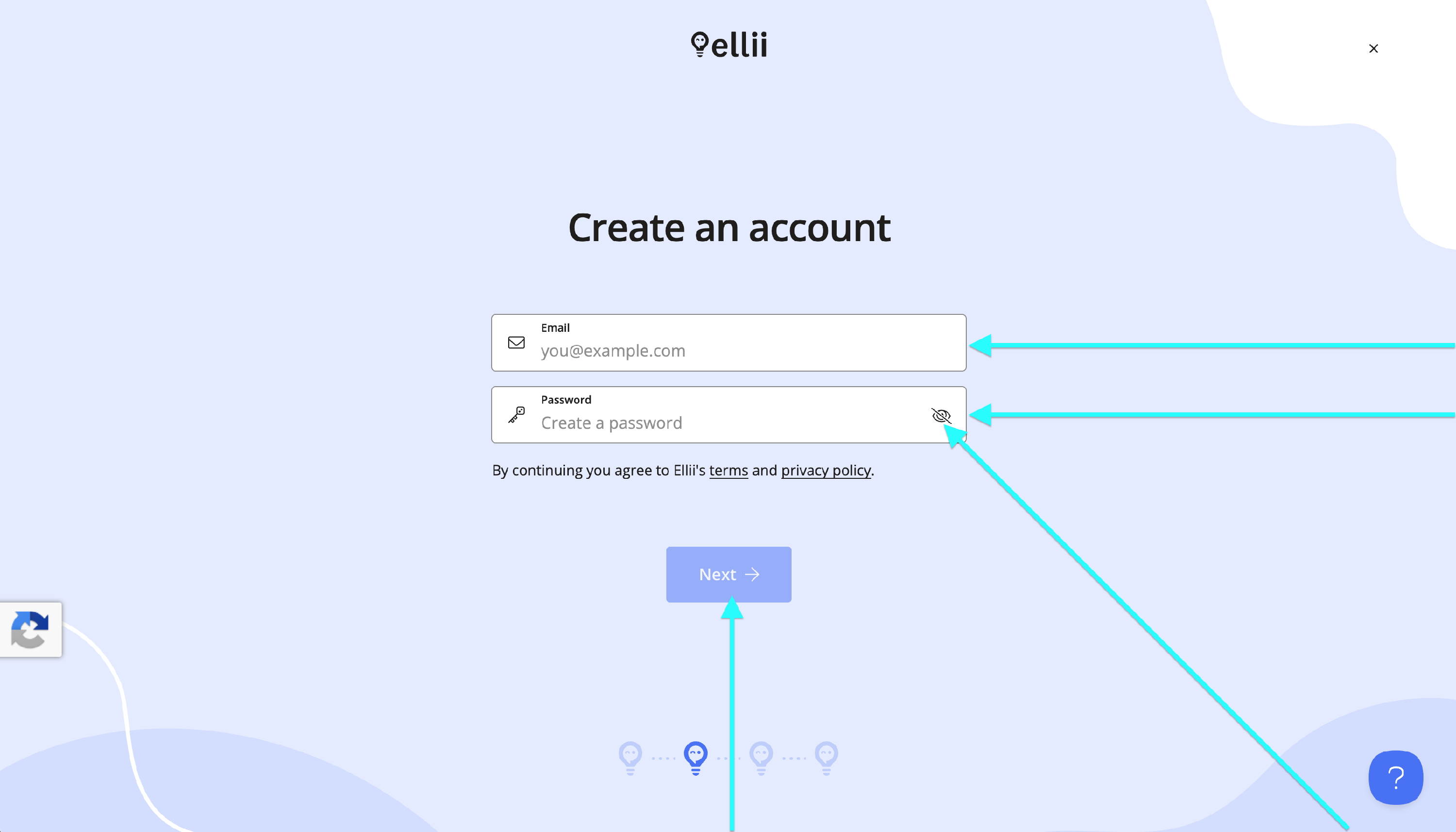 To create your account, you will enter your email address and chosen password. Clicking on the eye icon in the password field allows you to see the password you have chosen. By continuing, you agree to Ellii's terms and privacy policy. Click Next to continue.