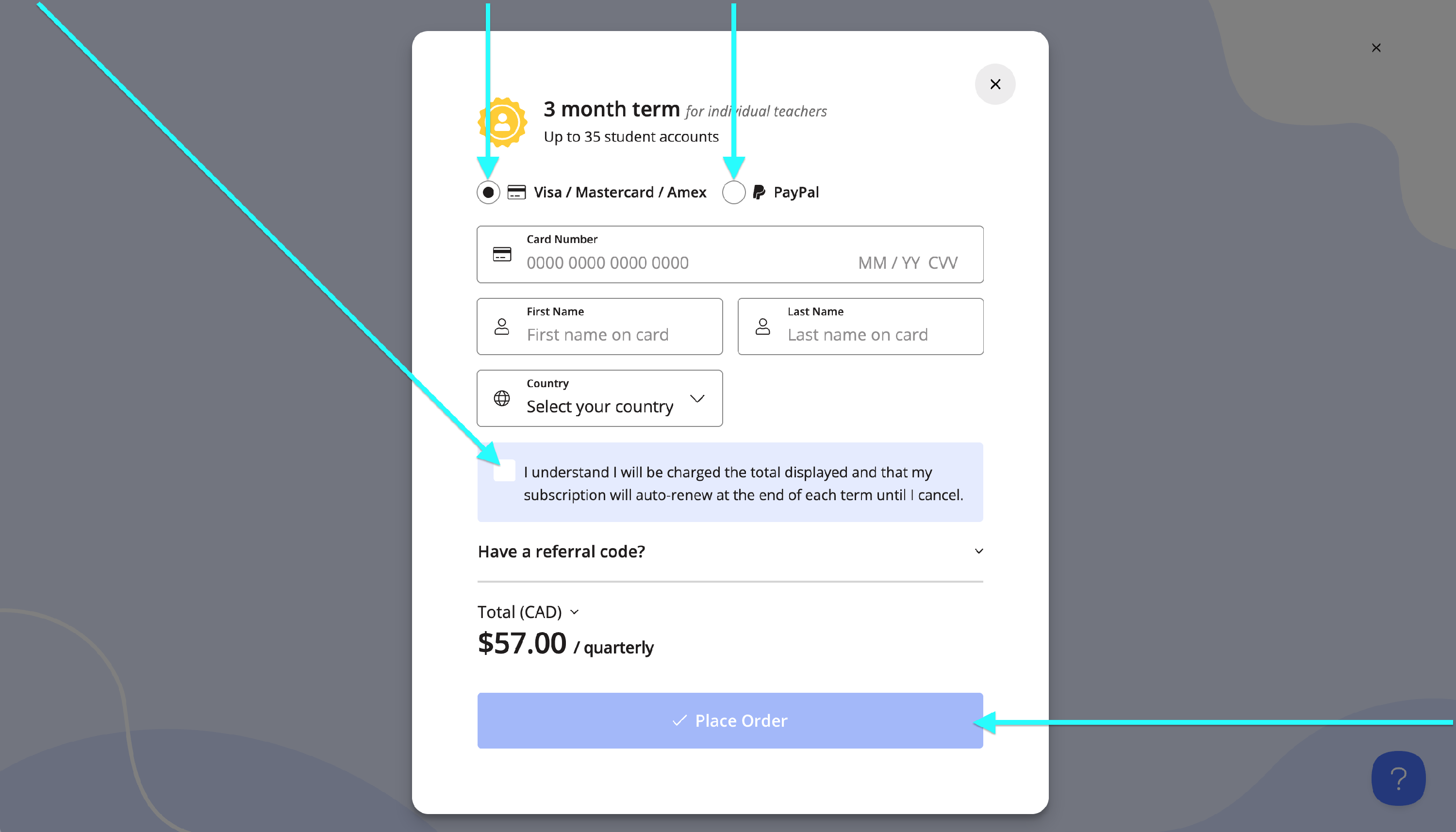 Check off the box next to our auto-renewal statement to indicate that you understand that you will be charged the total displayed and that your subscription will auto-renew at the end of each term until you cancel.